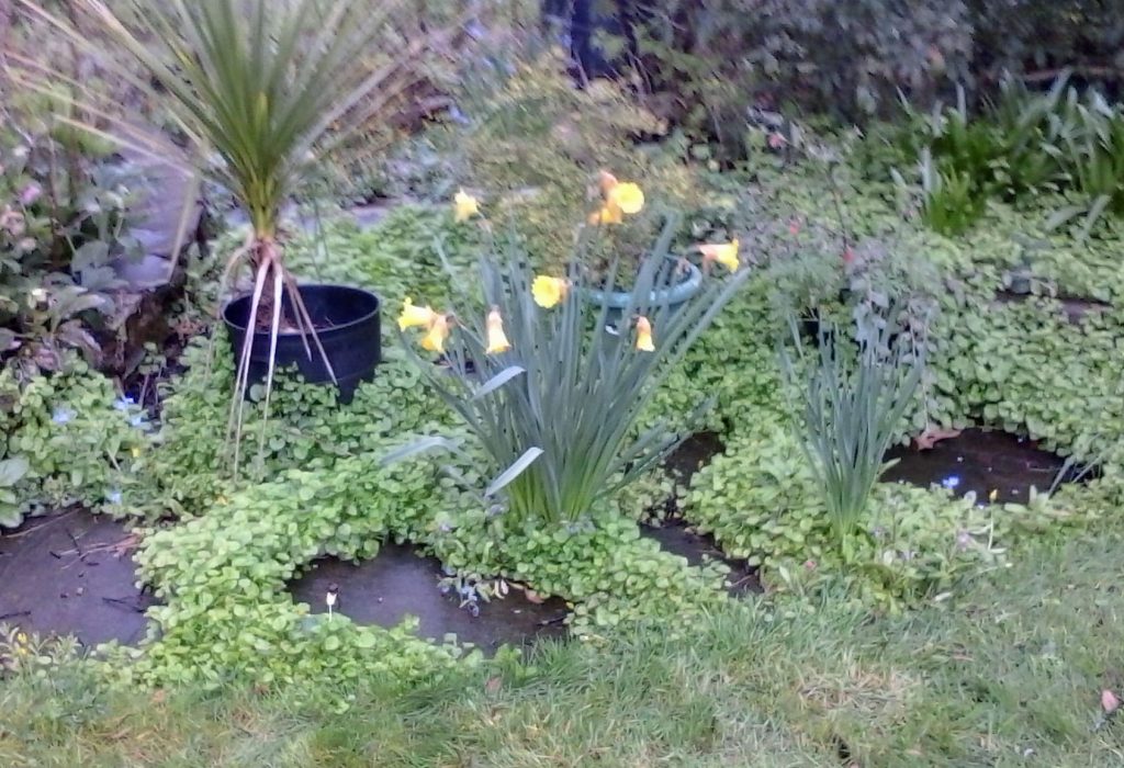 I came across these whilst working in a garden this morning – a clump of large flowered, yellow daffodils, growing up through crazy paving (along with some equally intrepid campanula).They’re going over now (apologies for the picture quality – I took it on my cheap smart phone). I wondered how they got there.